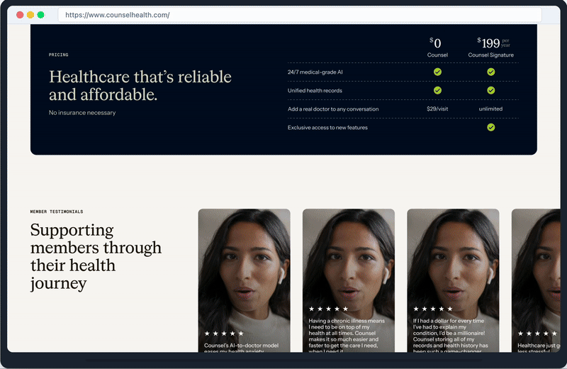 Counsel is an AI-first medical practice that allows clinicians to provide superhuman medical advice that is near-instant, highly personalized, and always available. In close collaboration with Counsel’s executive team, I implemented a beautiful brand refresh (designed by Herman Sheer), across marketing channels, including paid social, marketing landing pages, and Counsel’s content hub.